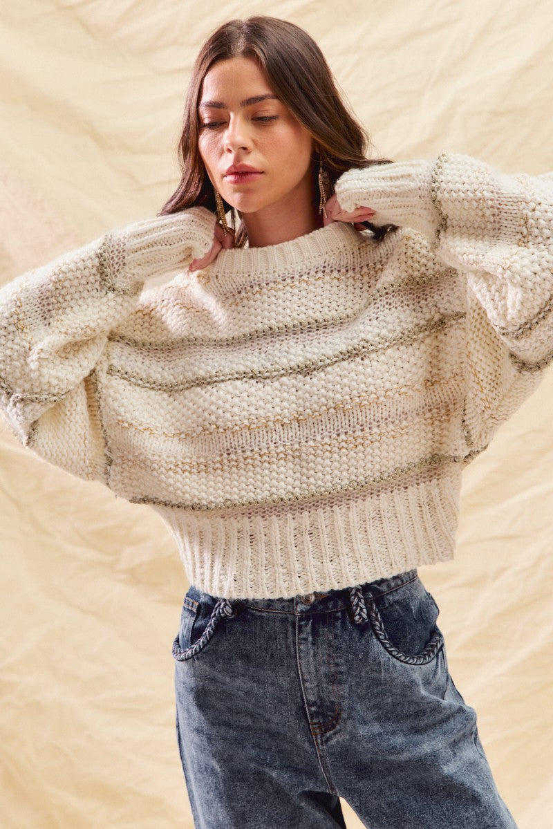 Festive vibes meet modern style with this textured stripe lurex holiday crop sweater. Shimmering metallic threads catch the light beautifully, while the cropped silhouette keeps things fresh and contemporary. The playful striped pattern adds visual interest, making it perfect for holiday parties, casual gatherings, or anyone ready to sparkle through the season. Pair it with your favorite high-waisted bottoms for an effortlessly chic look that says you're on everyone's nice list.