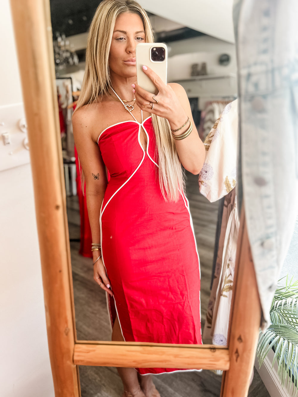 Make a statement in the Clock It Dress, a striking midi silhouette featuring a bold halter neckline and strategic cutout detailing. The rich red fabric is elevated by crisp white contrast piping that traces the neckline and accents the design, creating a sophisticated color-block effect. Perfect for evening events or elevated casual occasions, this dress combines modern edge with timeless elegance. The midi length offers versatility and polish, while the halter style provides confident, flattering support.