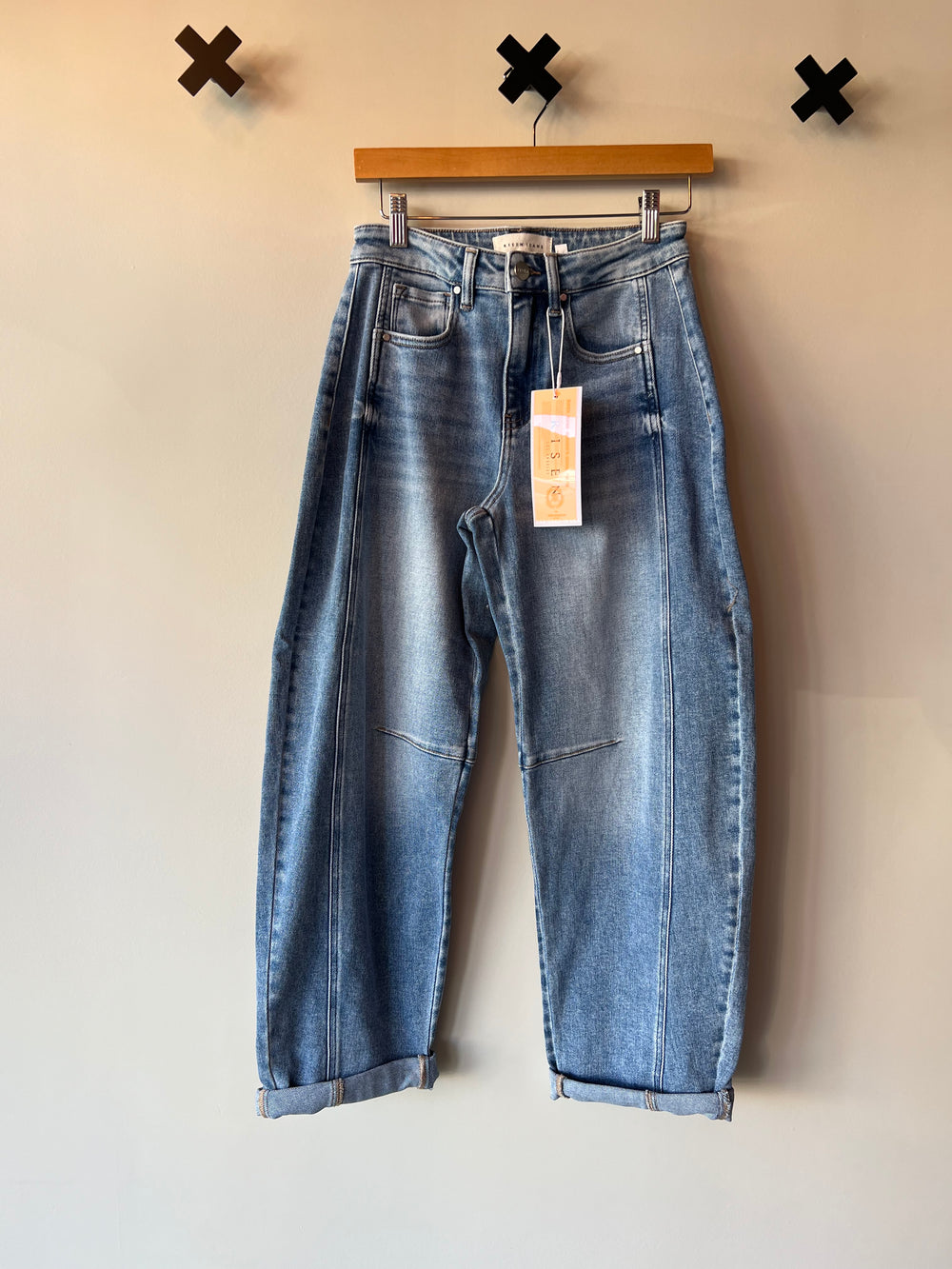Rise above the ordinary in these high-rise crop barrel jeans that hit just right. The medium wash keeps things cool and versatile, while the barrel leg gives you that effortlessly chic silhouette. Finished with a playful cuff that shows off your favorite sneakers or sandals, these denim essentials are ready to become your go-to for everything from coffee runs to night-out vibes. Comfort meets style in one seriously fun package.
