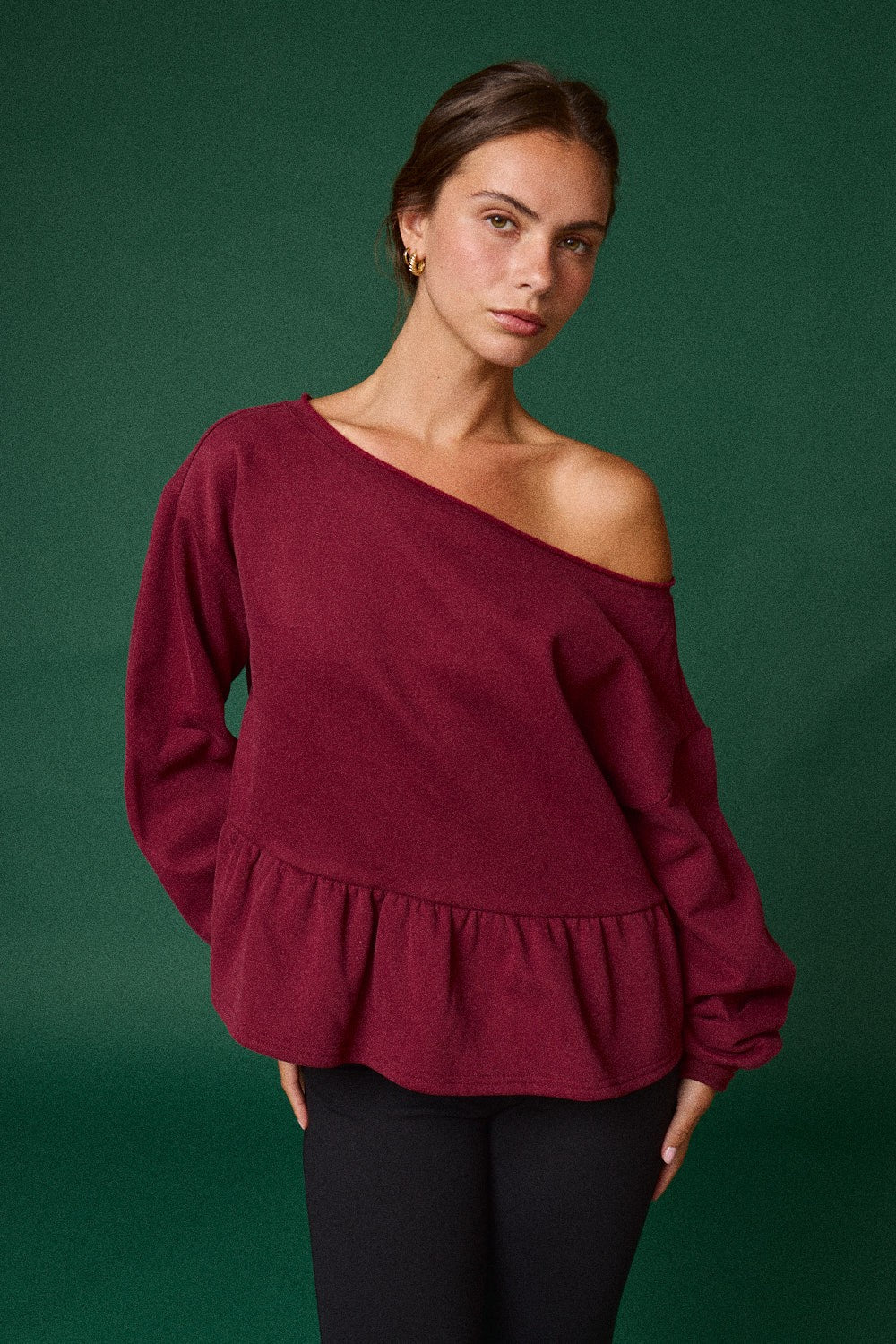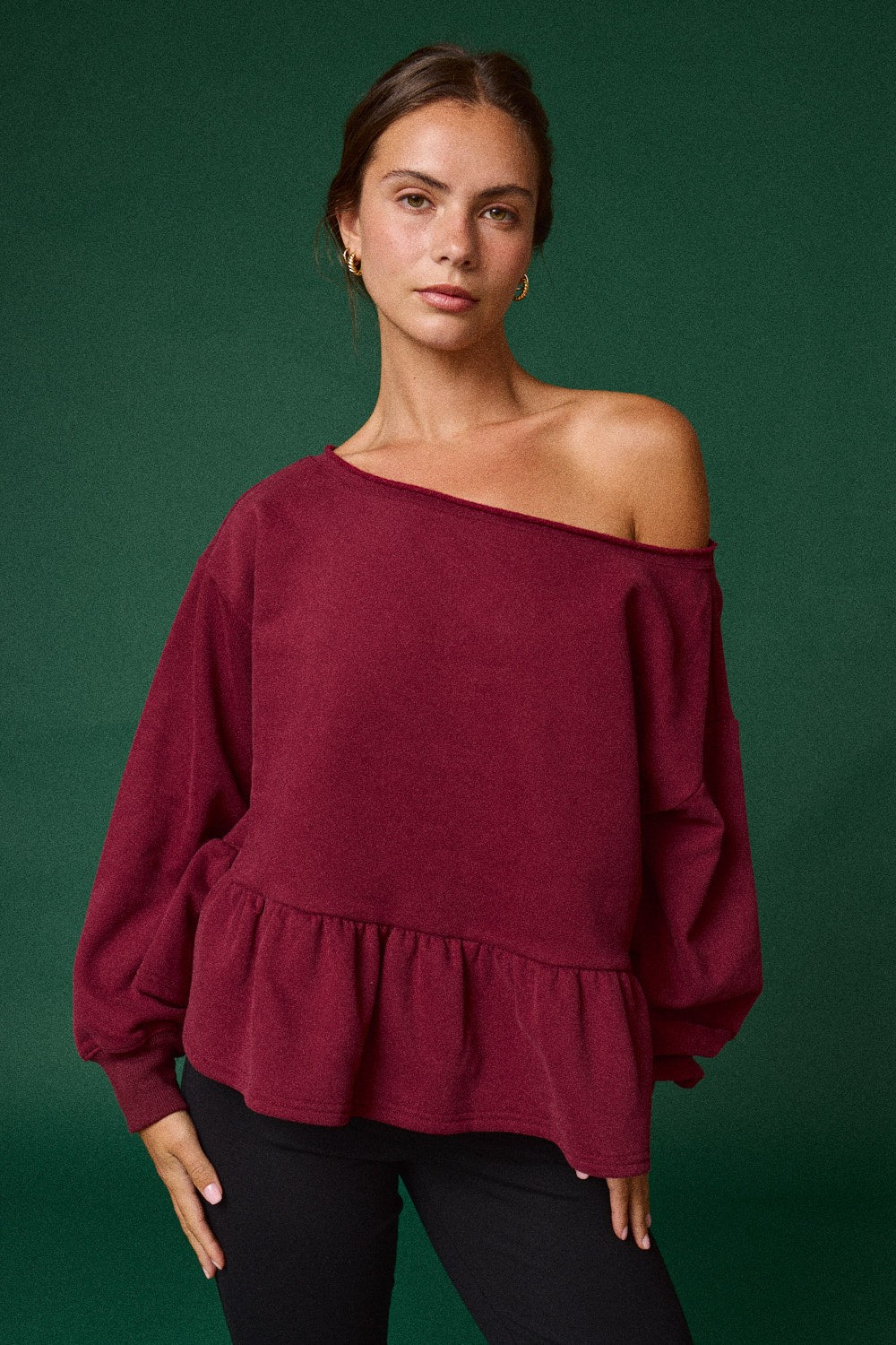 Elevate your casual game with this playful peplum hem sweatshirt that brings fun flair to everyday wear. The off-the-shoulder neckline offers a flirty, modern silhouette while the burgundy hue adds rich sophistication to your wardrobe. Perfect for layering or wearing solo, this cozy sweatshirt combines comfort with unexpected style details that make it a standout piece. Whether you're heading out for brunch or keeping it relaxed at home, this sweatshirt delivers personality with every wear.