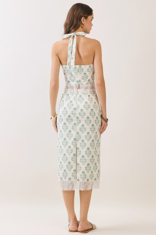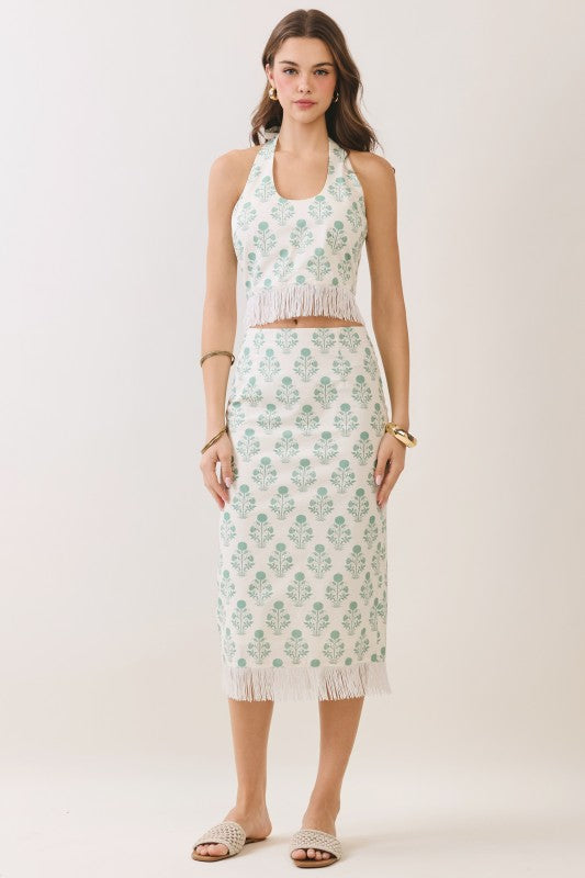 Pair it with the coordinating midi skirt, designed with a sleek high-rise waistband and straight silhouette. The delicate botanical print flows across the fabric, while a statement fringe trim adorns the hem. A concealed back zipper and back slit ensure comfort and ease of movement.