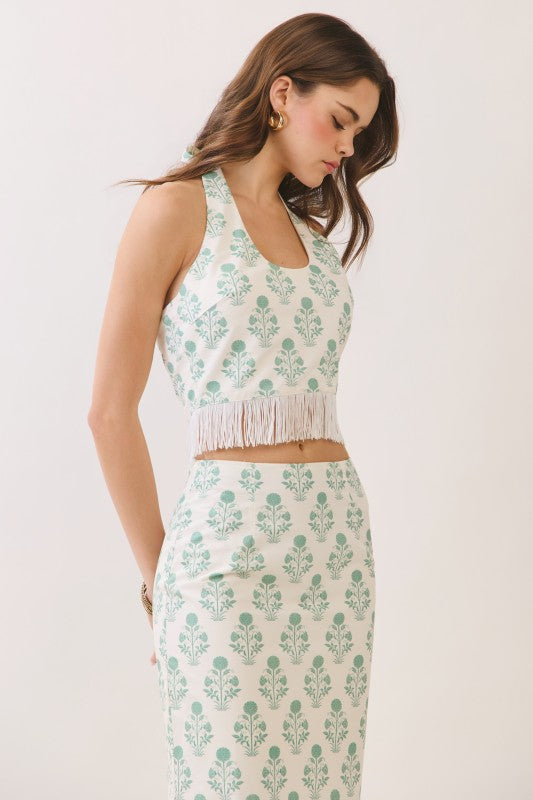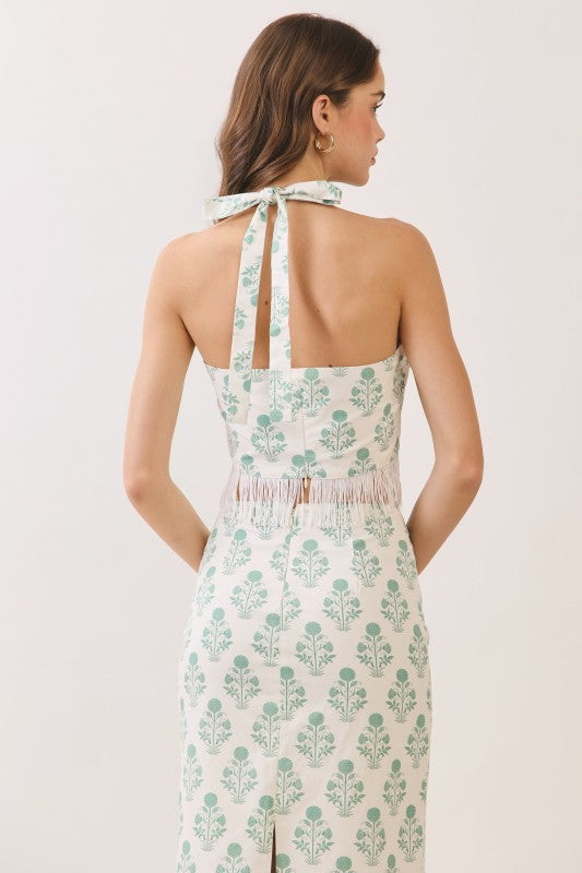 Elevate your wardrobe with this stunning two-piece set. The printed halter top features a scoop neckline and adjustable tie-back closure, showcasing a fitted bodice and open back for a contemporary look. Finished with a playful fringe hem and allover floral-inspired print.