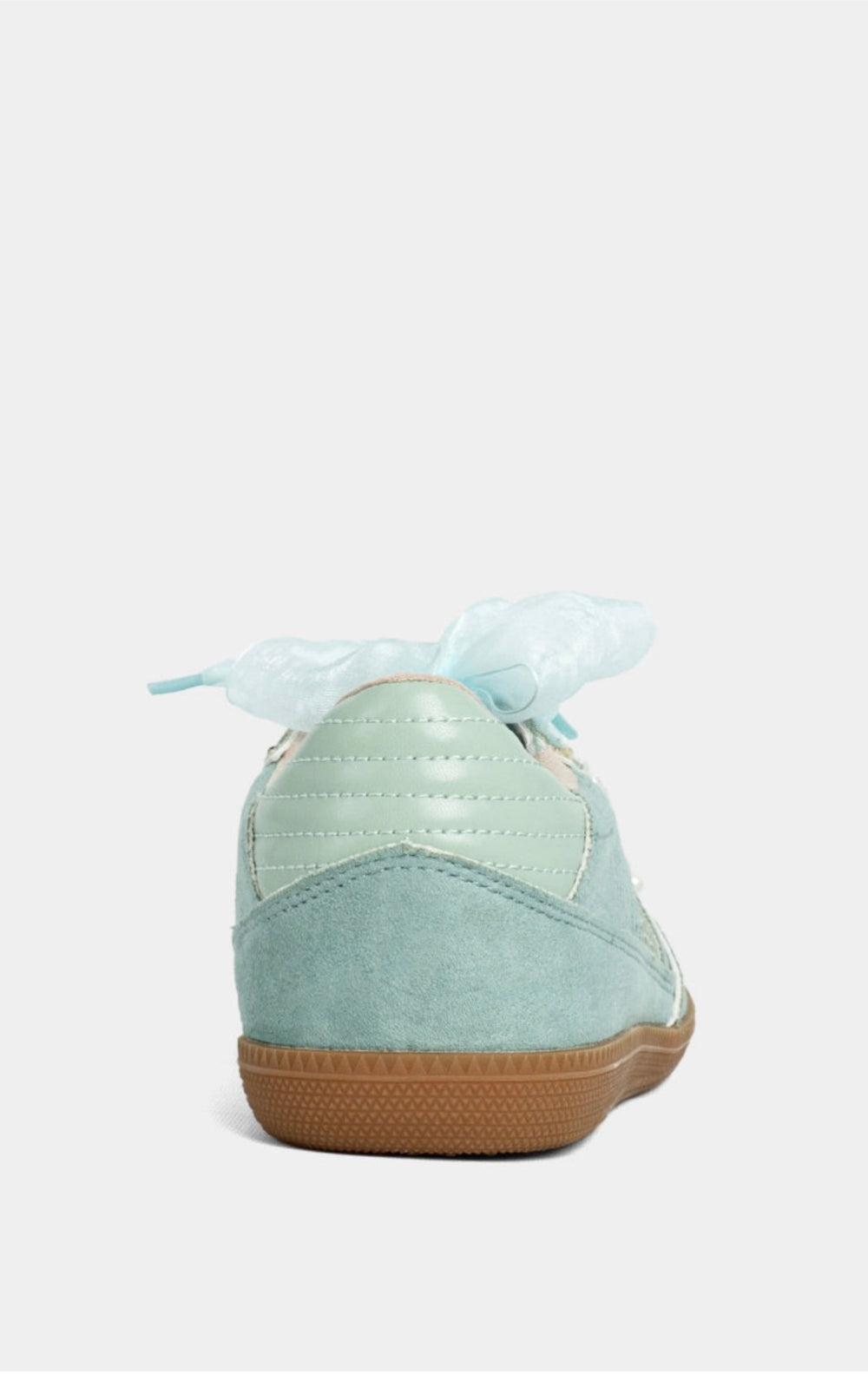 Playful, pastel, and ready to charm-this is the sneaker your wardrobe didn’t know it needed. Featuring soft aqua suede, crisp contrast details, and a dreamy mix of satin and faux pearl laces, this pair is all about making a statement without trying too hard. Grounded with a nostalgic gum sole, it blends retro-sport vibes with ultra-feminine flair.