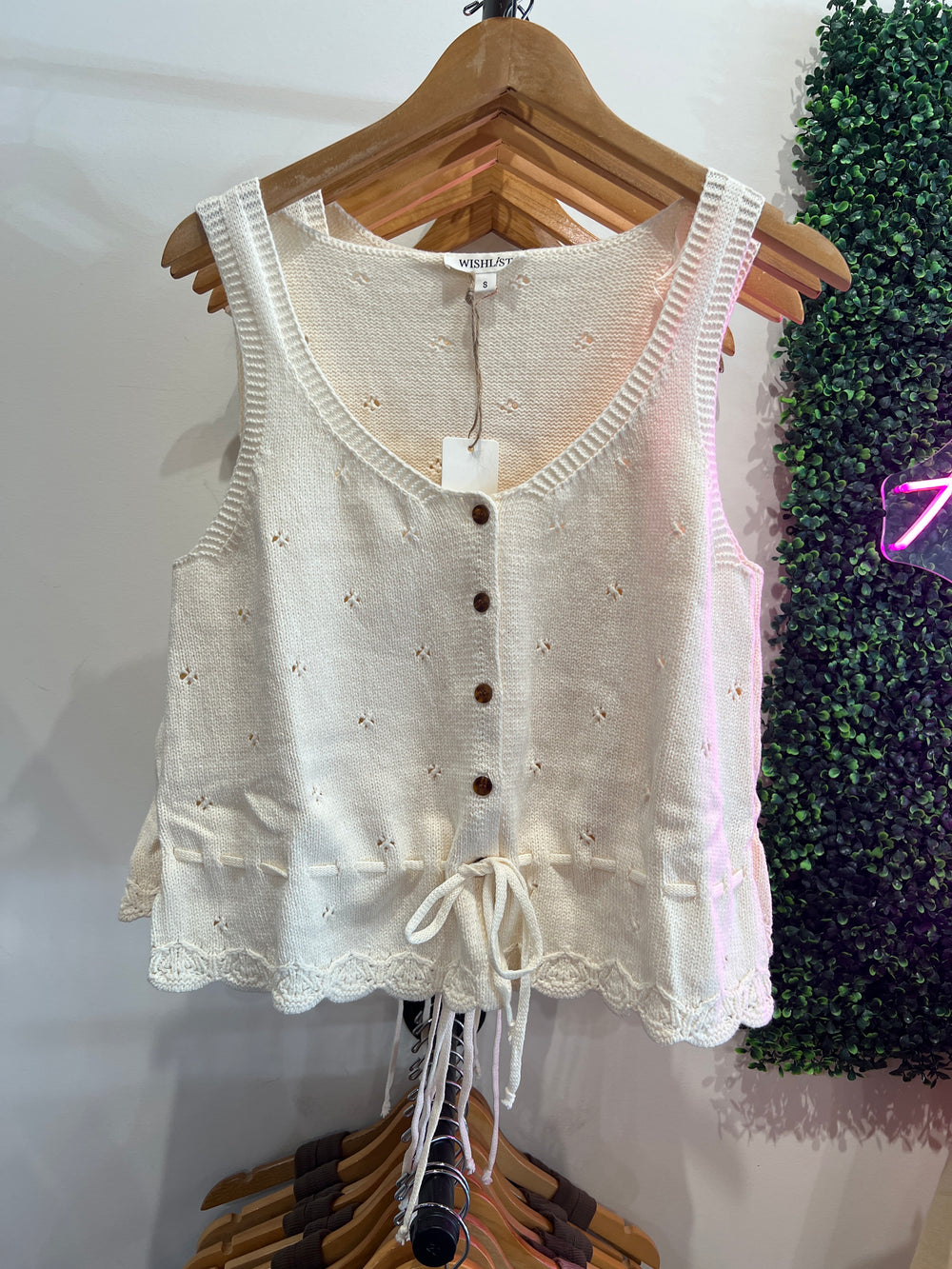 Elevate your layering game with this versatile sweater tank, designed with a charming scallop hem that adds feminine detail. Functional buttons down the front offer easy styling options, while the adjustable waist tie lets you customize the fit to flatter your silhouette. Perfect for pairing over tees or wearing solo, this piece transitions seamlessly from casual days to polished evenings. A wardrobe essential that combines comfort with contemporary style.
