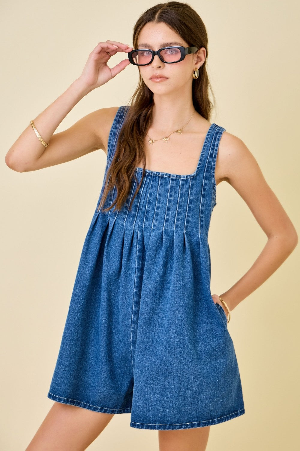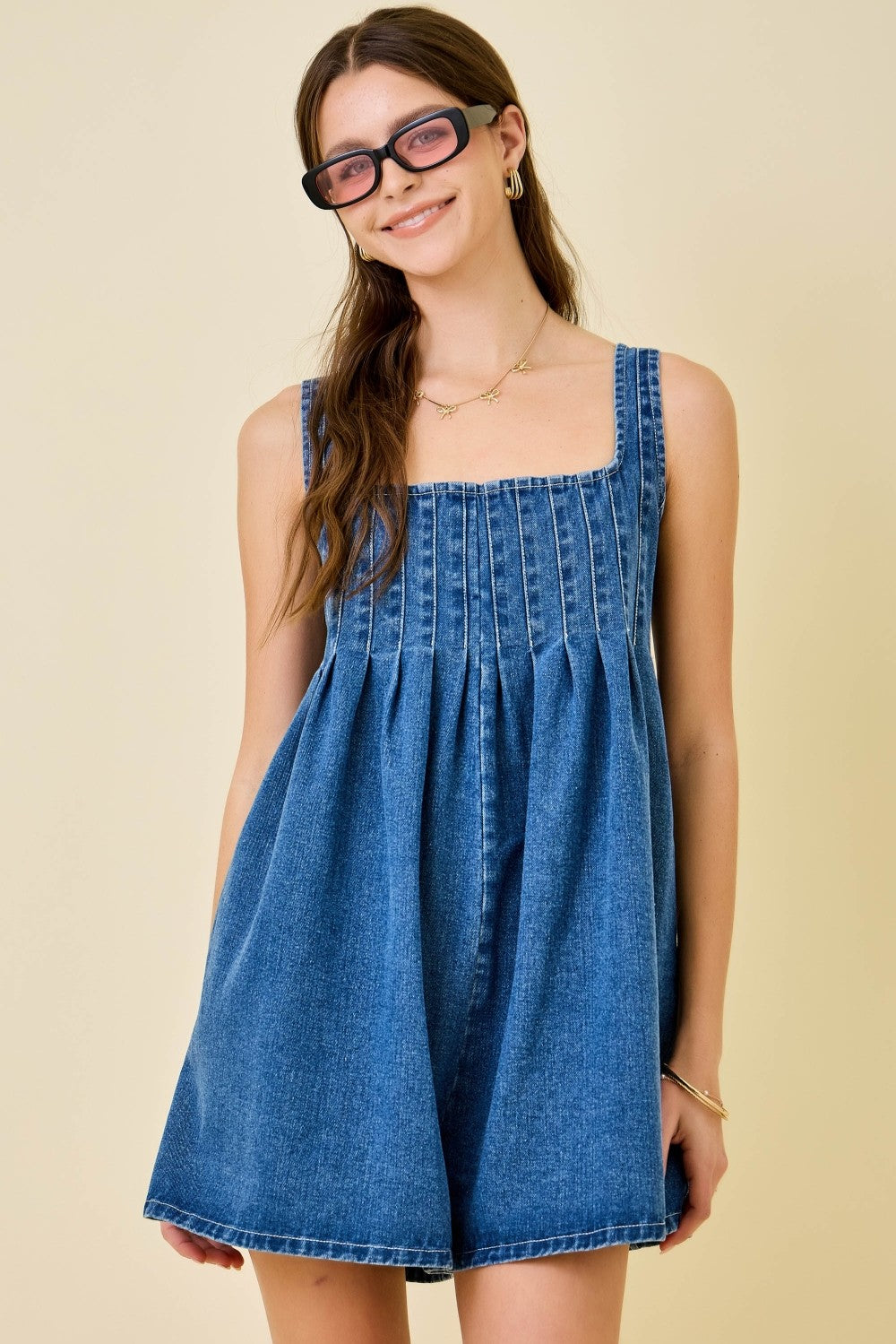 Daydream in denim with this playful sleeveless romper that's equal parts chic and fun. Pintuck details create flattering lines while the relaxed wide-leg cut keeps things breezy and carefree. The surprise elastic open back? Pure flirtation. Throw it on for coffee runs, beach days, or those spontaneous evening plans—this romper is ready for whatever adventure calls.