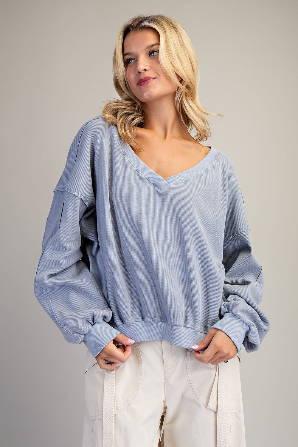 Snow washed two tone long sleeve top featuring a V-neckline, exposed seams